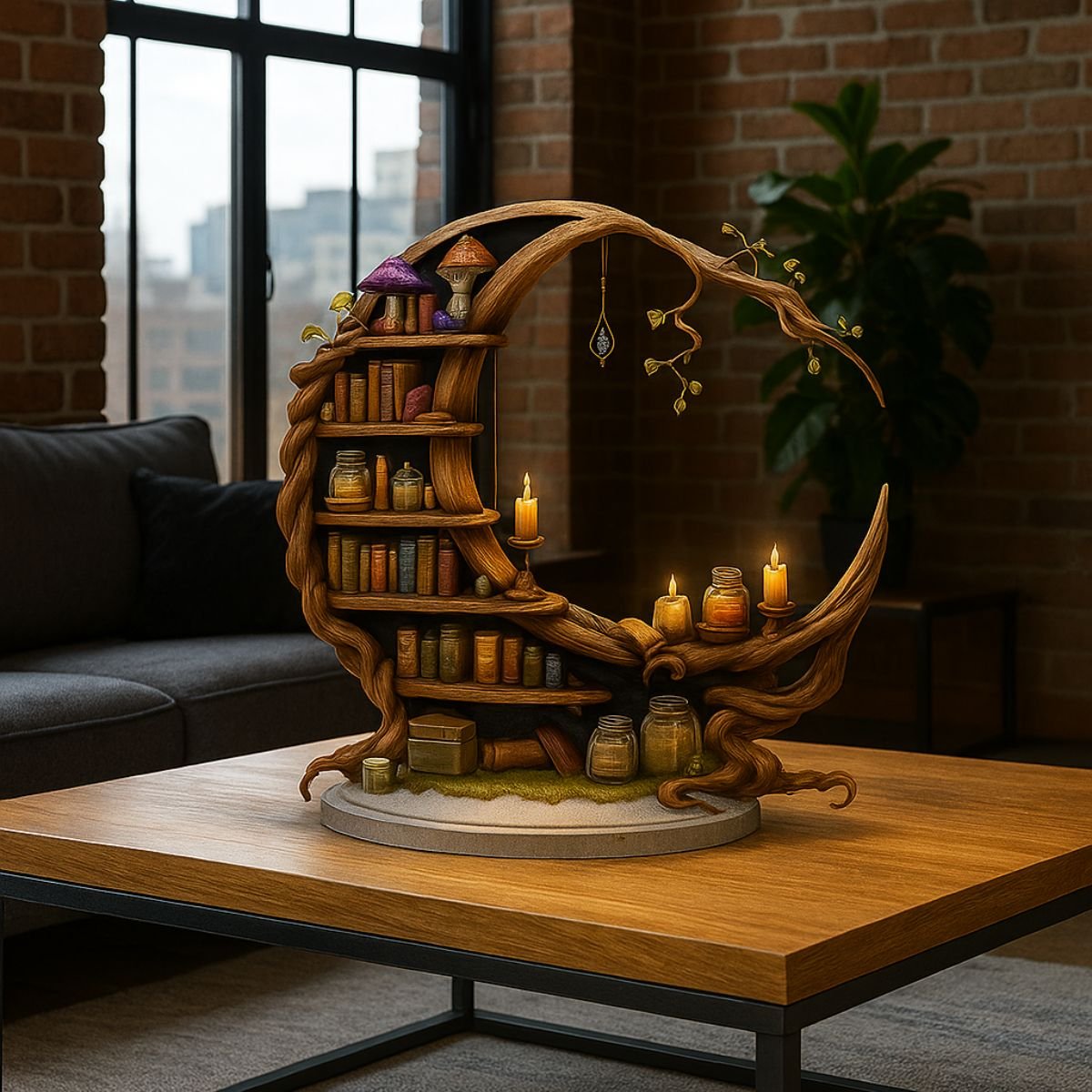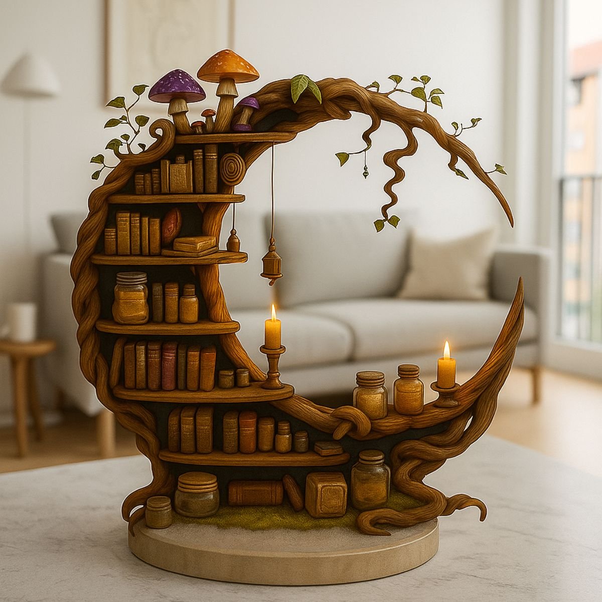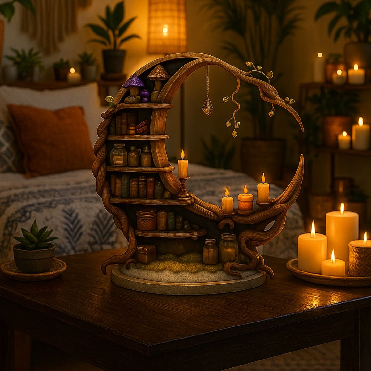 • Unique crescent moon shelf design for mystical décor