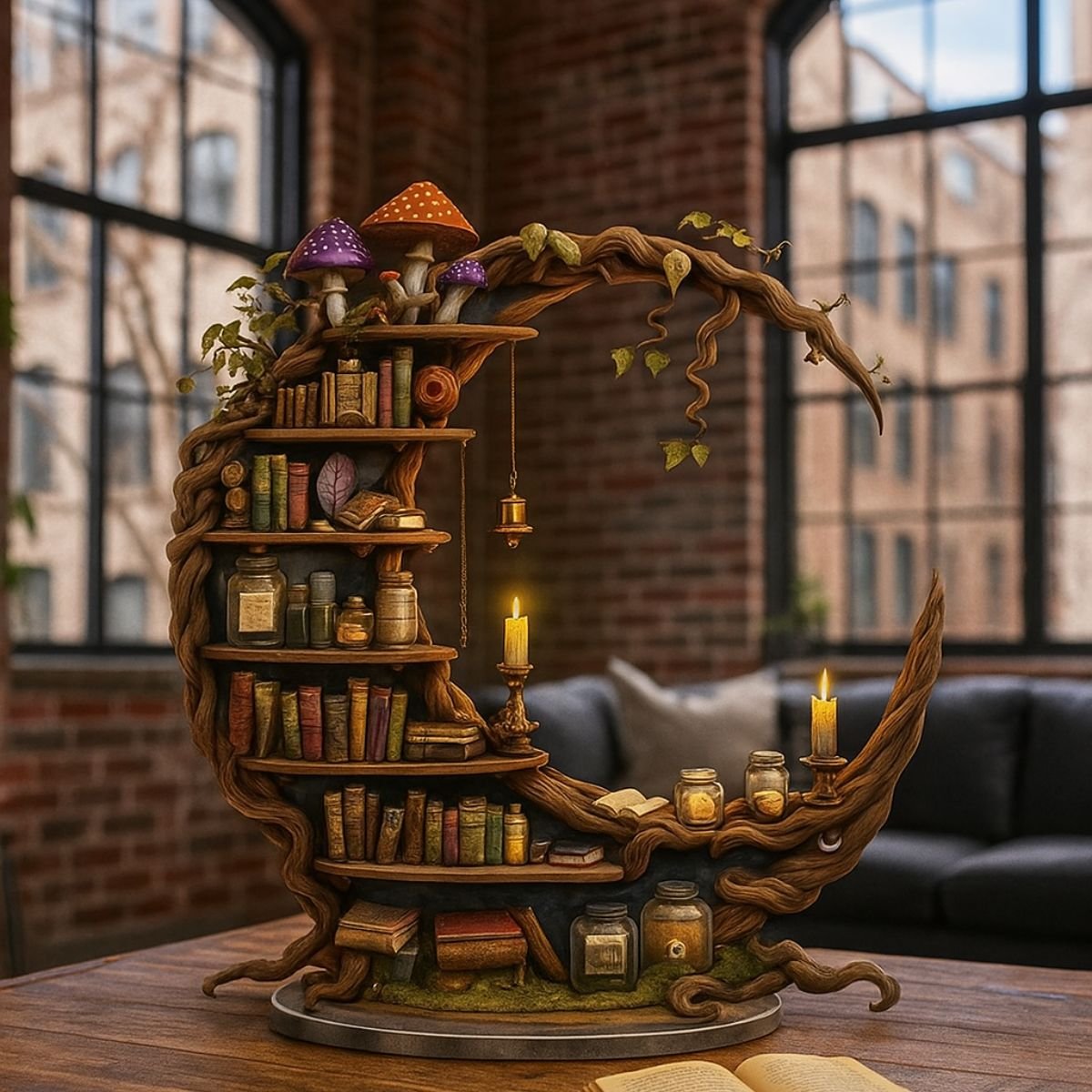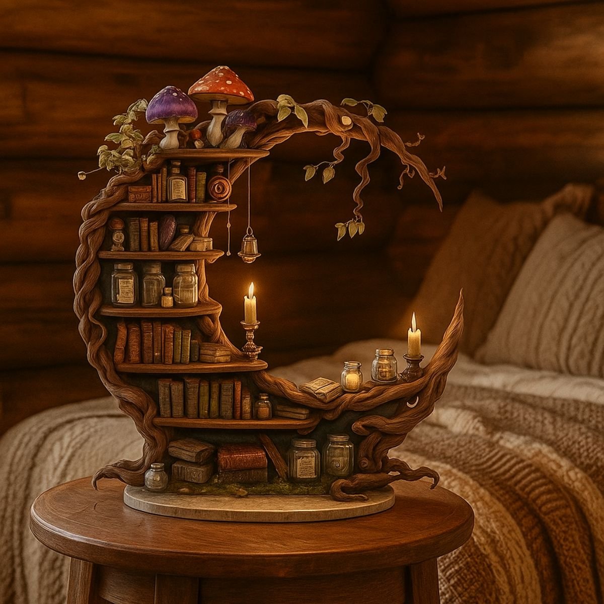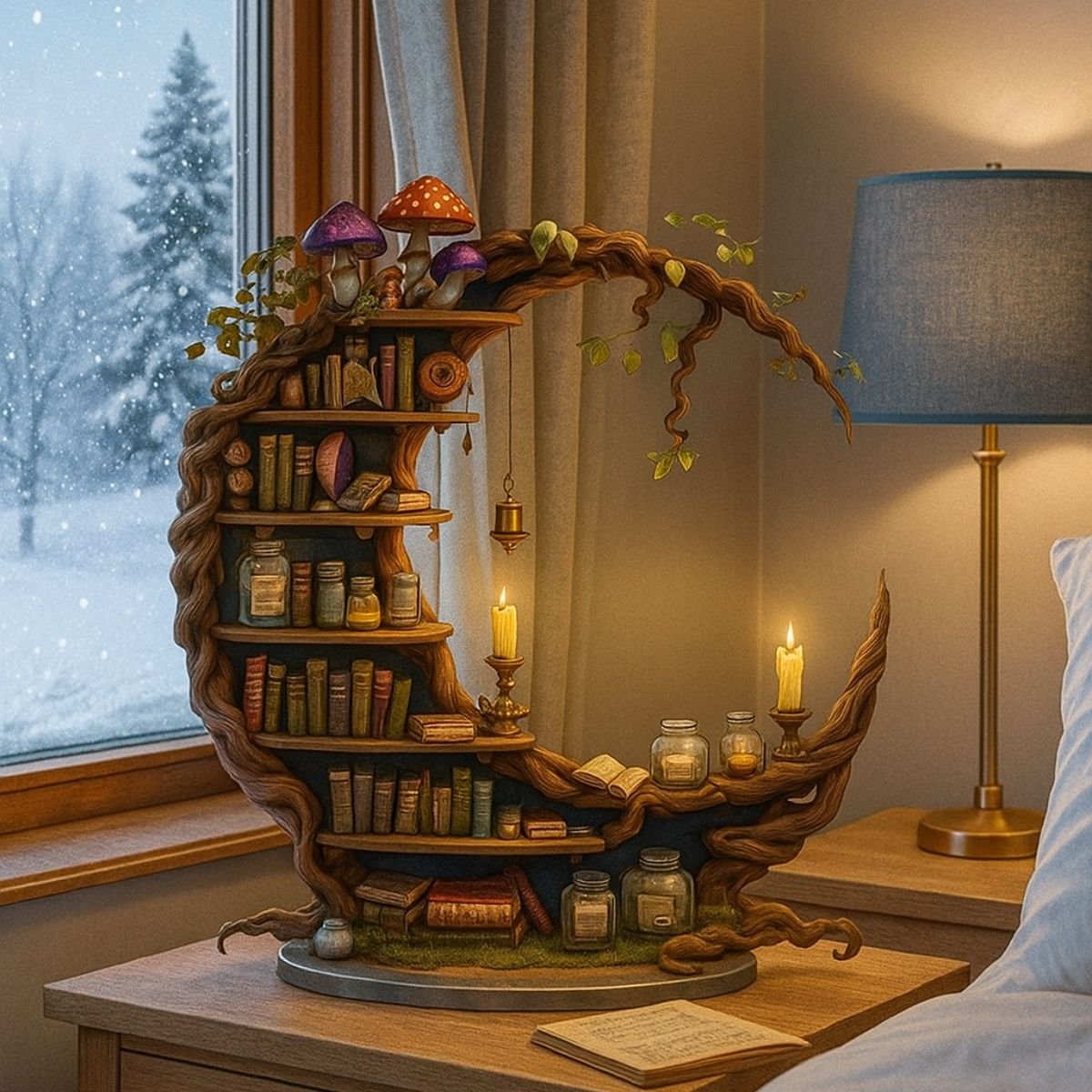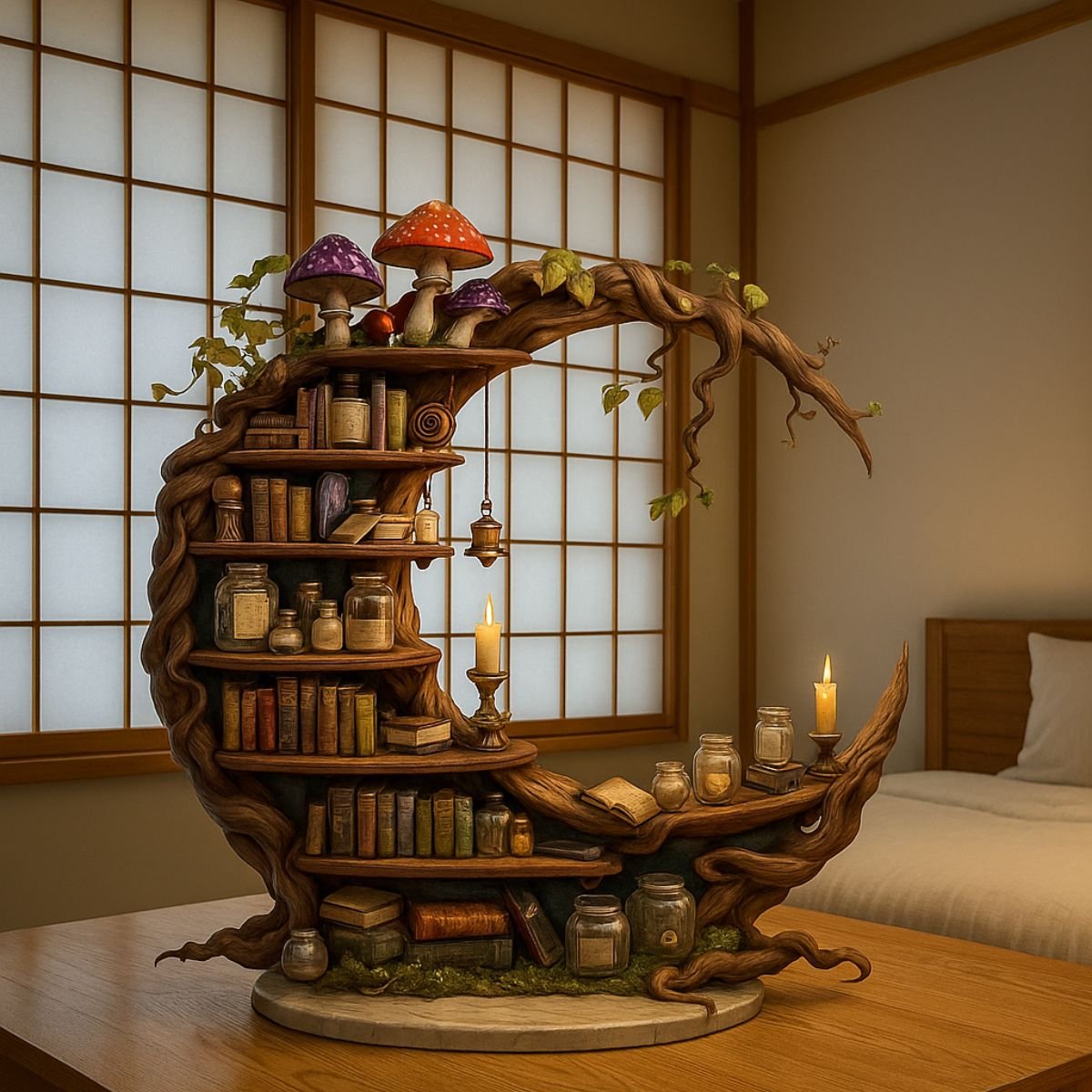 • Unique crescent moon shelf design for mystical décor