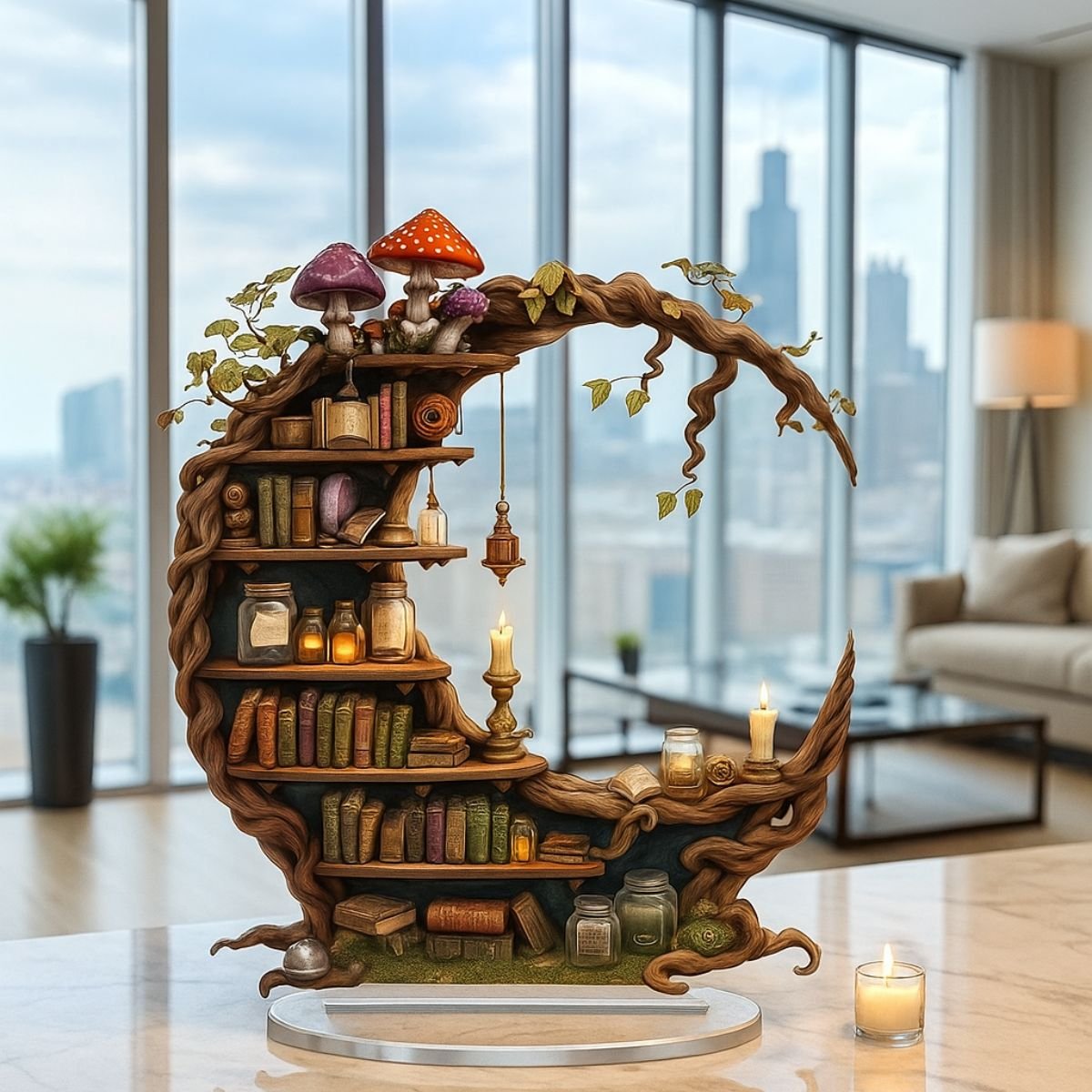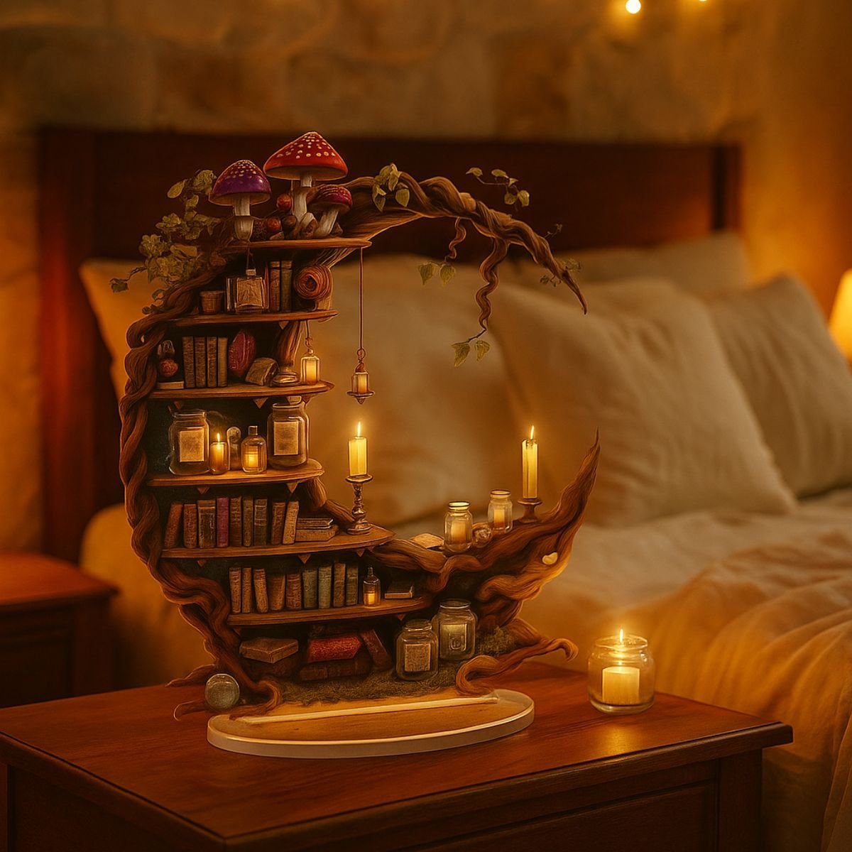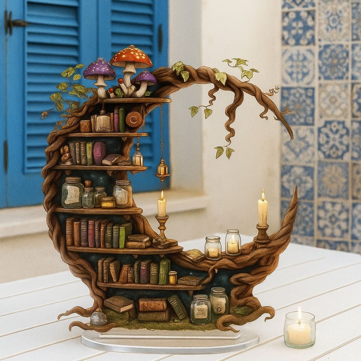 This moon shelf isn’t just decorative – it’s versatile and functional. Use it to display crystals, candles, or small keepsakes, or let it stand alone as a piece of art. Its lightweight acrylic construction makes it easy to hang, while the sturdy design ensures durability. The combination of books and mushrooms appeals to lovers of fantasy, cottagecore, and celestial aesthetics, making it a thoughtful gift for birthdays, housewarmings, or festive occasions. It’s equally suited for bedrooms, living rooms, or creative workspaces, adding a mystical touch wherever it’s placed. The crescent moon design also resonates with themes of renewal and imagination, making it a meaningful décor choice.